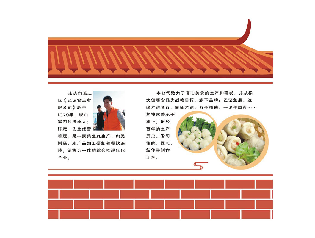 汕頭市濠江區(qū)乙記食品有限公司一非遺保護單位,坐落于海產(chǎn)品資源豐富、漁業(yè)發(fā)達、素有達濠食品“千金之港”、魚米之鄉(xiāng)美譽的汕頭市濠江區(qū)。乙記食品創(chuàng)辦于1879年,是一家集水產(chǎn)品及肉類制品生產(chǎn)、食品加工研發(fā)、批發(fā)銷售為一體的食品供應商,現(xiàn)有廠房占地面積.>2000平方米。公司主打產(chǎn)品涵蓋:魚冊、魚餃、牛肉丸、魚丸、蝦丸、墨斗丸、豬肉丸、豬肚丸等20余種產(chǎn)品。在生產(chǎn)經(jīng)營方面,業(yè)務范圍不斷擴大,旗下多種產(chǎn)品獲“汕頭名小吃”稱號,魚冊制作技藝于2019年被列為市級非物質(zhì)文化遺產(chǎn)。截至到2022年底,乙記食品旗下已有20家加盟商,旗下品牌“乙記”、“丸子師傅”知名度及美譽不斷攀升,業(yè)務覆蓋全國范圍,主要集中在廣東省內(nèi)。
