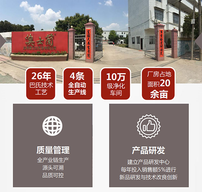? 澳士蘭乳品加工廠位處汕頭金平蓮塘工業(yè)區(qū)(潮汕三市交界),公司目前擁有玻璃瓶裝、塑料杯裝、塑料桶裝、屋頂型紙盒裝等全自動生產(chǎn)線。