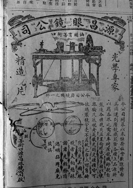 又過了幾年,洋眼鏡不再滿足成品進入汕頭市場銷售,開始把制鏡設備引進汕頭埠,全面占領汕頭眼鏡市場。下面這則是刊登于民國十年汕頭《平報》的源昌眼鏡公司廣告: