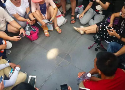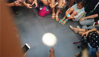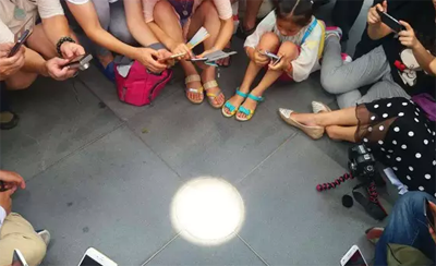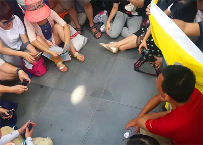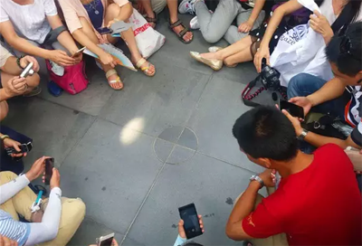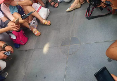 正午之前,這些游客已經迫不及待地圍坐在標志塔基座的中央,紛紛拿出手機,期待美妙時刻的到來。