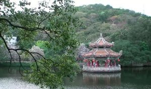 過橋之后,沿湖濱至山下。名勝古跡,樓臺亭榭,比比皆是,每處古跡都有一個雅稱,如“古洞佛燈”“水仙夜月”“紫竹鐘聲”等等。