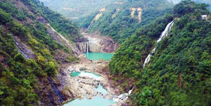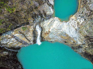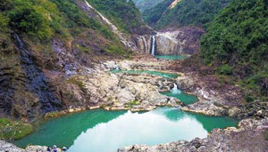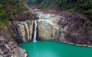 航拍架橋潭百丈潭瀑布,流水自高而下匯成一潭碧水。