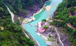 無人機視角下,一汪碧水如同一塊巨大的“翡翠”。