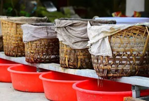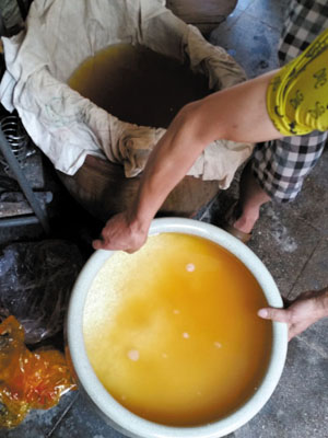 從山上采來(lái)諸如鴨腳木、埔荊、梔子枝之類的小灌木,將雜柴燒成灰燼之后,淋上開(kāi)水再攪拌均勻,過(guò)濾出堿液,隔一夜沉淀,就成了制作梔粽的主要原料——黃色的梔水,這是做桅棕的不二"法寶"。