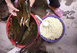包梔粽,講究緊,一定得緊。白竹葉一定要帶水排疊,盡量使其緊密。在白竹葉正中間放進(jìn)一勺子浸泡梔汁的糯米,鋪平為長(zhǎng)方形。然后將米兩邊的白竹葉折后包裹起來(lái),再用筷子折最后兩邊。精心包扎后,用蘆葦絲纏繞縛緊。
