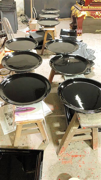 見到胡楚雄,他正從宜賓李莊古鎮(zhèn)參加會議返汕,“此次我代表廣東古建界應(yīng)邀出席第九屆中國古建營造技術(shù)保護(hù)與發(fā)展學(xué)術(shù)會議暨優(yōu)秀傳統(tǒng)建筑保護(hù)傳承創(chuàng)新作品展,與同行交流,收獲頗豐?!背錾?975年的大漆師傅胡楚雄由于工藝精湛,在隴美村遠(yuǎn)近聞名,14歲時,他開始從事祖?zhèn)鞯拇笃崾炙?,至今?1年。