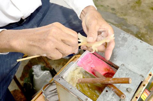 潮汕的糖塑不但為節(jié)日增添喜慶氣氛,也變成了一種樸素的民間市井文化。街頭僅僅一平方米的空間就給了藝人一個創(chuàng)造藝術(shù)的大舞臺。記者在現(xiàn)場看到,陳才授的擔子很簡單,一個木箱,上面有木架,布滿插孔,用于插上做好的“猴糖”;木箱里面是一個特制的小火炭爐,用來加熱糖稀。爐上方固定著兩個方鍋,盛滿紅、黃兩種顏色的糖稀。木箱上還有四個小抽屜,用來盛放雜物。此外,還有兩把糖鍬、一把剪子、兩根竹簽、一支帶“耳”的鐵條,一支上粗下尖的鐵棒。