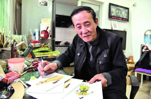 在位于市區(qū)杏花橋旁一住宅樓,記者找到了陳衍庭的家,這也是潮劇盔頭的“生產(chǎn)基地”。在這個(gè)幾十平方米的小房子里,陳衍庭與妻子、大女兒、小女兒圍坐在客廳制作潮劇盔頭,他們有的在紙板上繪制著復(fù)雜的圖案、有的一刀一劃雕刻著潮劇繁復(fù)的花式、有的忙著給“零件”外殼上彩繪……