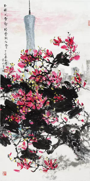 林耀繪畫(huà)作品構(gòu)思巧妙,他曾將廣州、香港等地的代表性建筑和景觀與紫荊融合在一起,在紫荊花印襯下,作品既有歷史的積淀也有今天的繁榮,相得益彰,別具激情。此次個(gè)展突顯出東莞人文風(fēng)采,將黃大仙公園、東江、千年古秋楓樹(shù)等東莞標(biāo)志性景觀元素融入畫(huà)作之中,整體風(fēng)格大氣磅礴,蔚為大觀。
