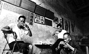 30年前的潮州市郊祠堂的喝茶圖,工夫茶、卷褲腿、板凳,還有潮汕經(jīng)典跍(ku)。