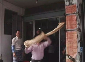 龍湖酥糖的制作過(guò)程。制作者先將白糖、麥芽糖、蔥花和豬油熬制成深琥珀色的糖漿,接著將裝著濃糖漿的鍋放入冷水中旋轉(zhuǎn)、冷卻,促使糖漿凝結(jié)。當(dāng)糖漿凝結(jié)成糖塊,但還沒有變硬的時(shí)候,制作者迅速將它掛在門口的木釘上。隨后,幾名小伙子輪番上陣,使出全力來(lái)拉伸、攪拌這塊糖。經(jīng)過(guò)不斷地拉伸攪拌,空氣逐漸進(jìn)入糖塊之中,原本琥珀色的糖塊開始變白,手感變得更松軟,富有韌性,這個(gè)時(shí)候,就可以將花生仁加入糖塊中壓制了,而花生仁也必須是剛剛炒制的,必須帶著高溫,才能融入糖塊之中?!?/p>